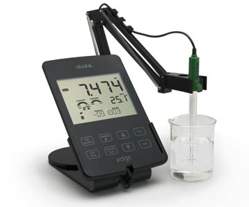 El nuevo medidor de sobremesa Edge empleado para las mediciones de pH, cuenta con reconocimiento automático de electrodo donde se informa del tipo de sensor, calibración y número de serie. Cuenta con descarga de datos tanto a pen drive (USB) como a ordenador mediante puerto mini USB. El Edge cuenta con el sistema exclusivo CAL-CHECK de aviso, si el electrodo utilizado no está limpio o si las soluciones han sido contaminadas durante la calibración. En los casos de sensores con matching pin, el CAL-CHECK también avisa si la membrana del electrodo está rota o si el punto de unión está obstruido.